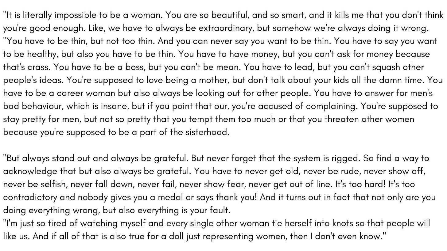 I think I’m blaming Barbie for more than her little anatomically inaccurate shoulders can carry. And if the monolog above makes women feel seen, again, who am I to deprive us of that? But we have been here before.